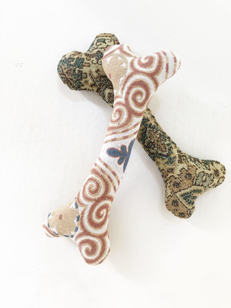 These are 100% cotton canvas or natural wool felt toys stuffed with cloud wool instead of polyester. Though we can’t smell it, the wool makes it a great toy for scent games- as well as tug of war and fetch. Small is about 9 inches long and large is about 12.