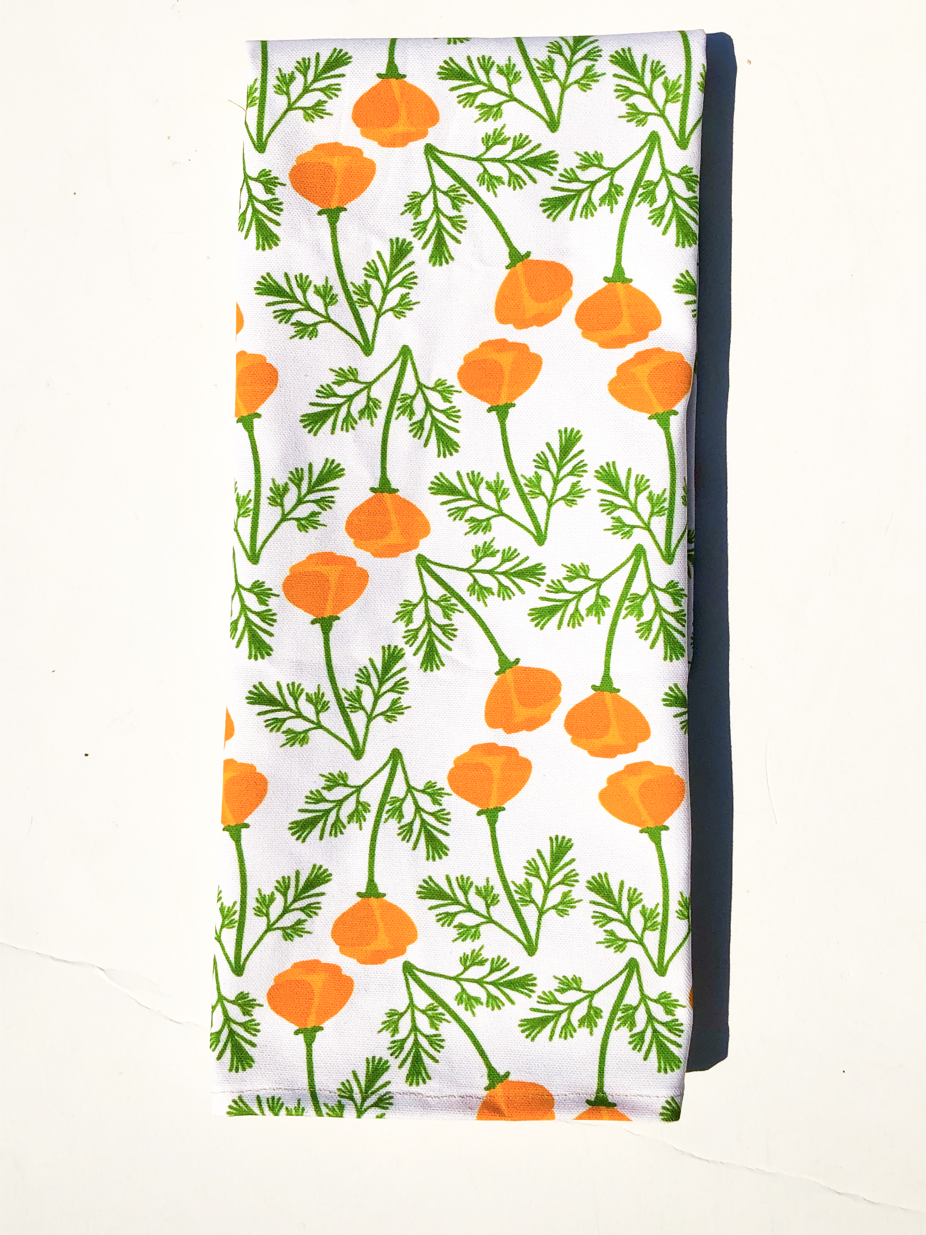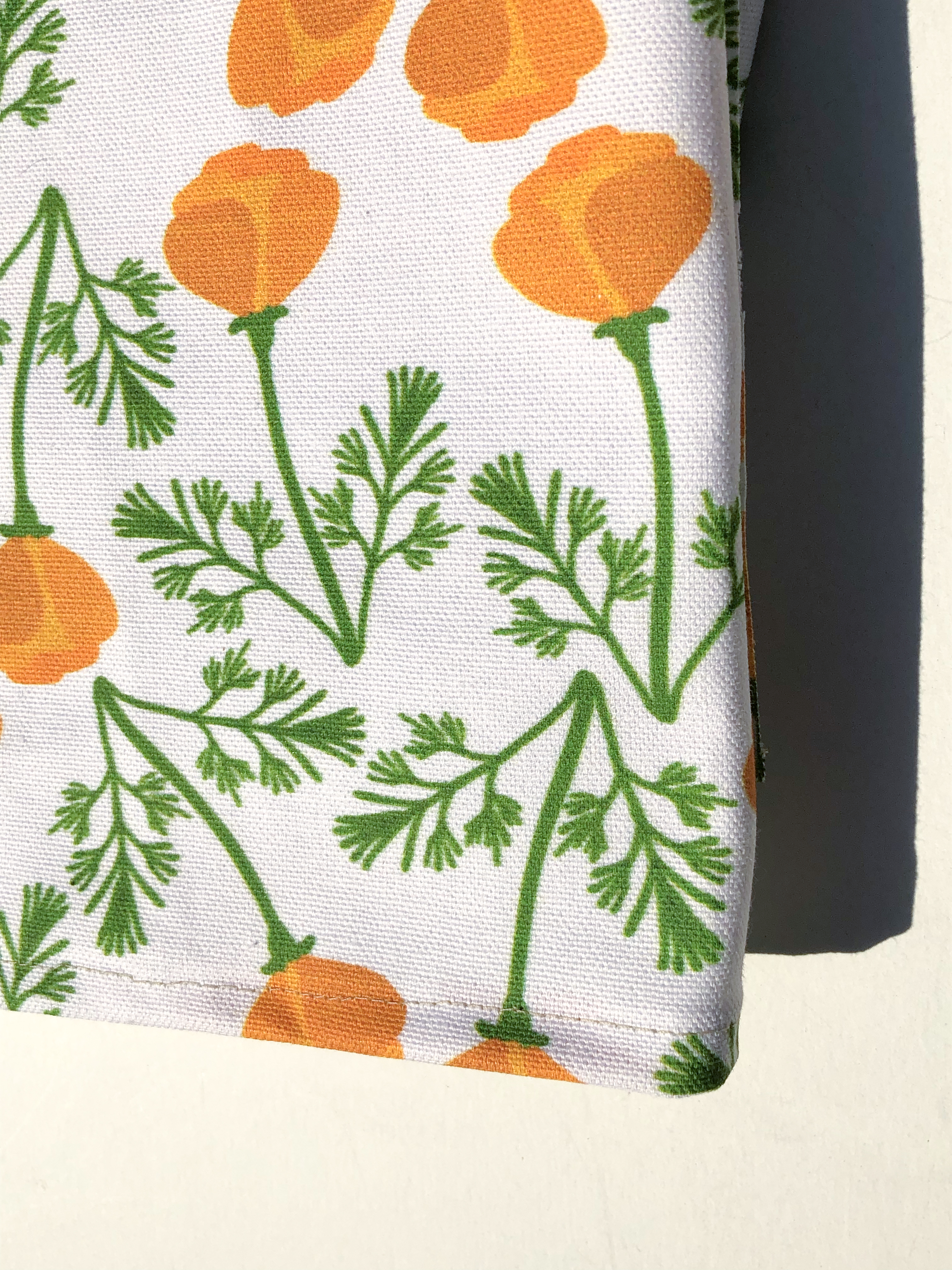 The California Poppy Kitchen Towel is the first release in my line of hand sewn kitchen towels. I am releasing  2 new kitchen towels this fall season. I design the pattern and I work with a local small business to print my design on fabric, which I cut and sew myself.