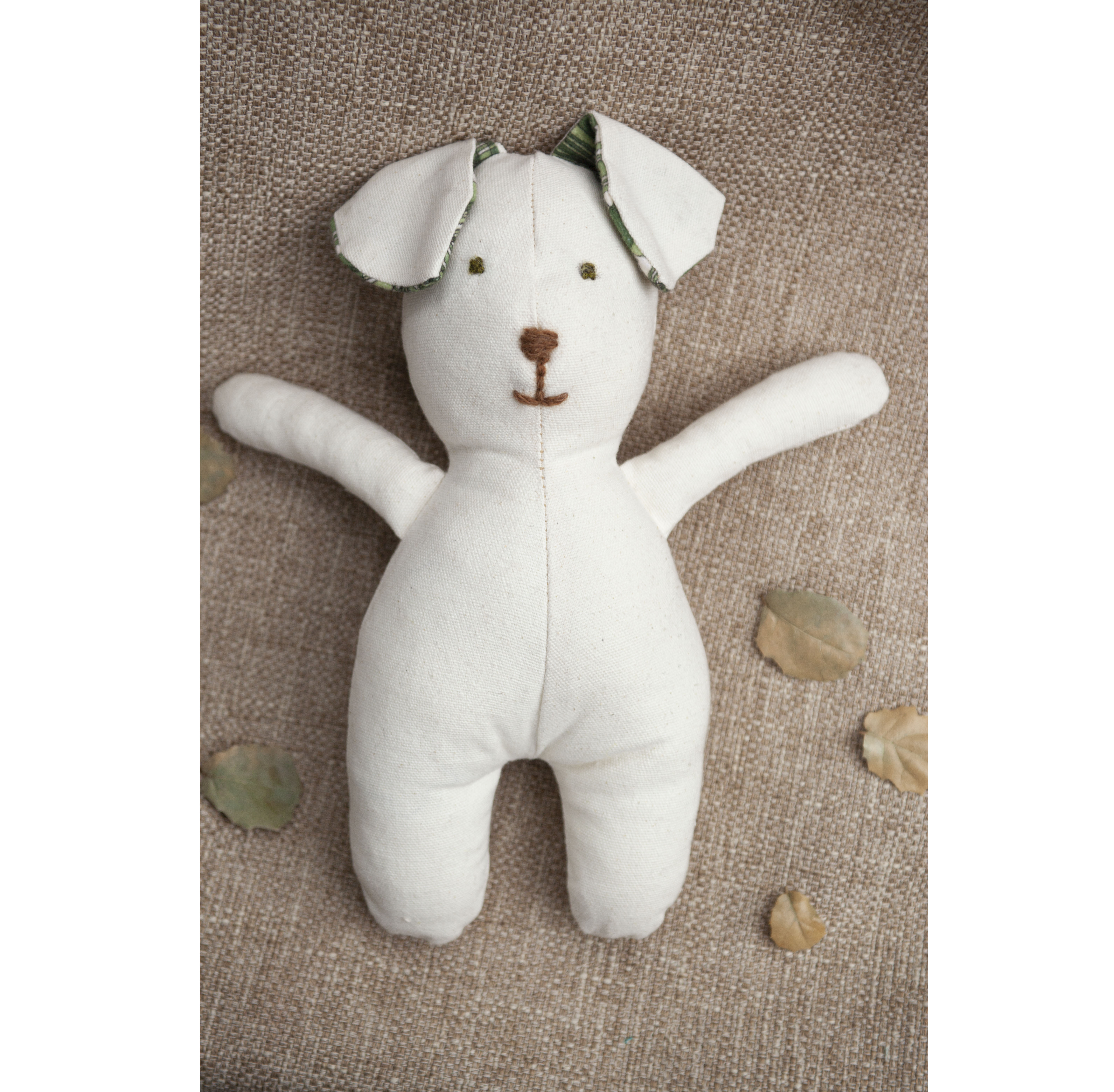 I created the pattern for this puppy, which I create from cotton canvas with flannel ears. He is 11 inches tall.