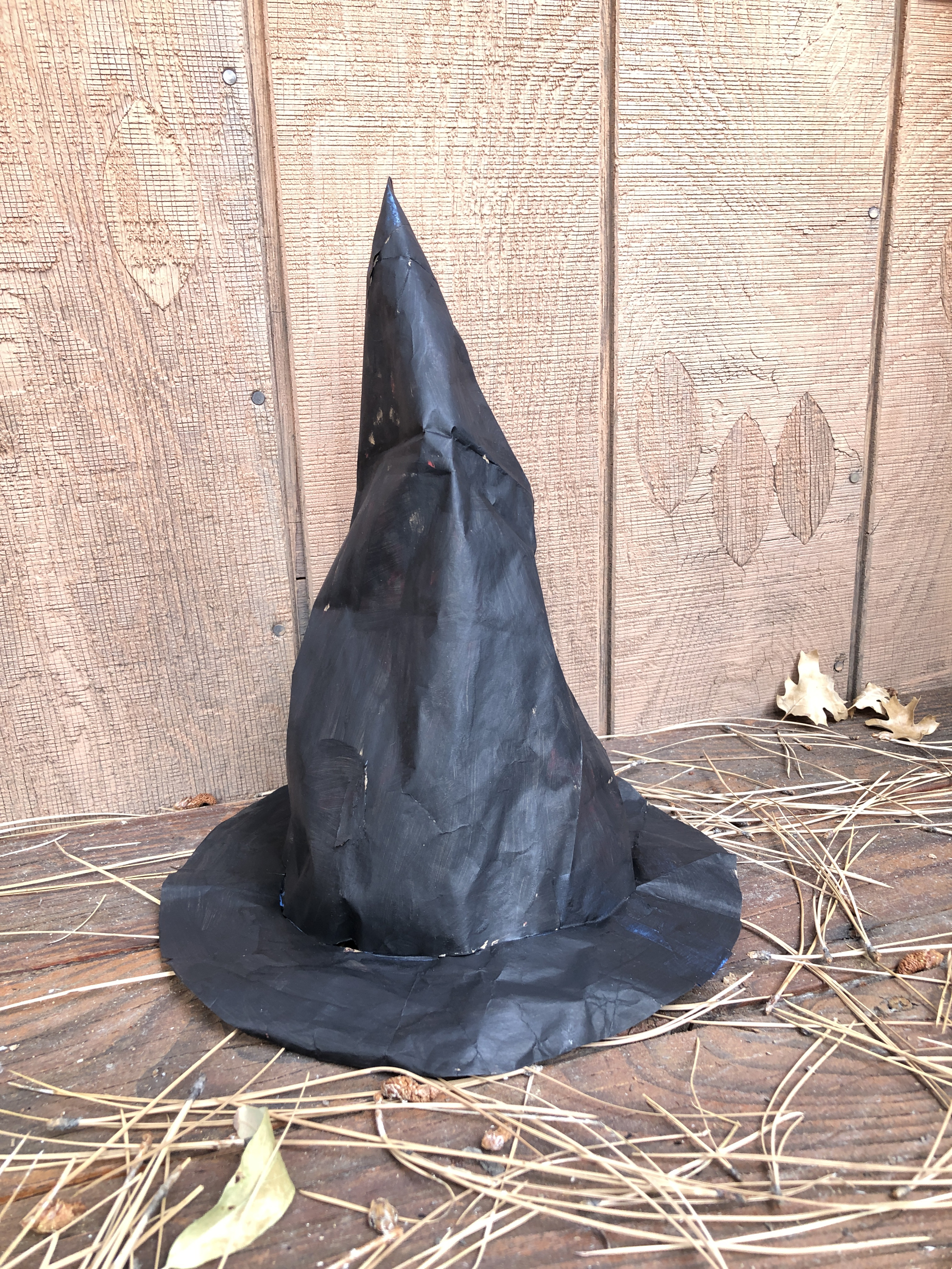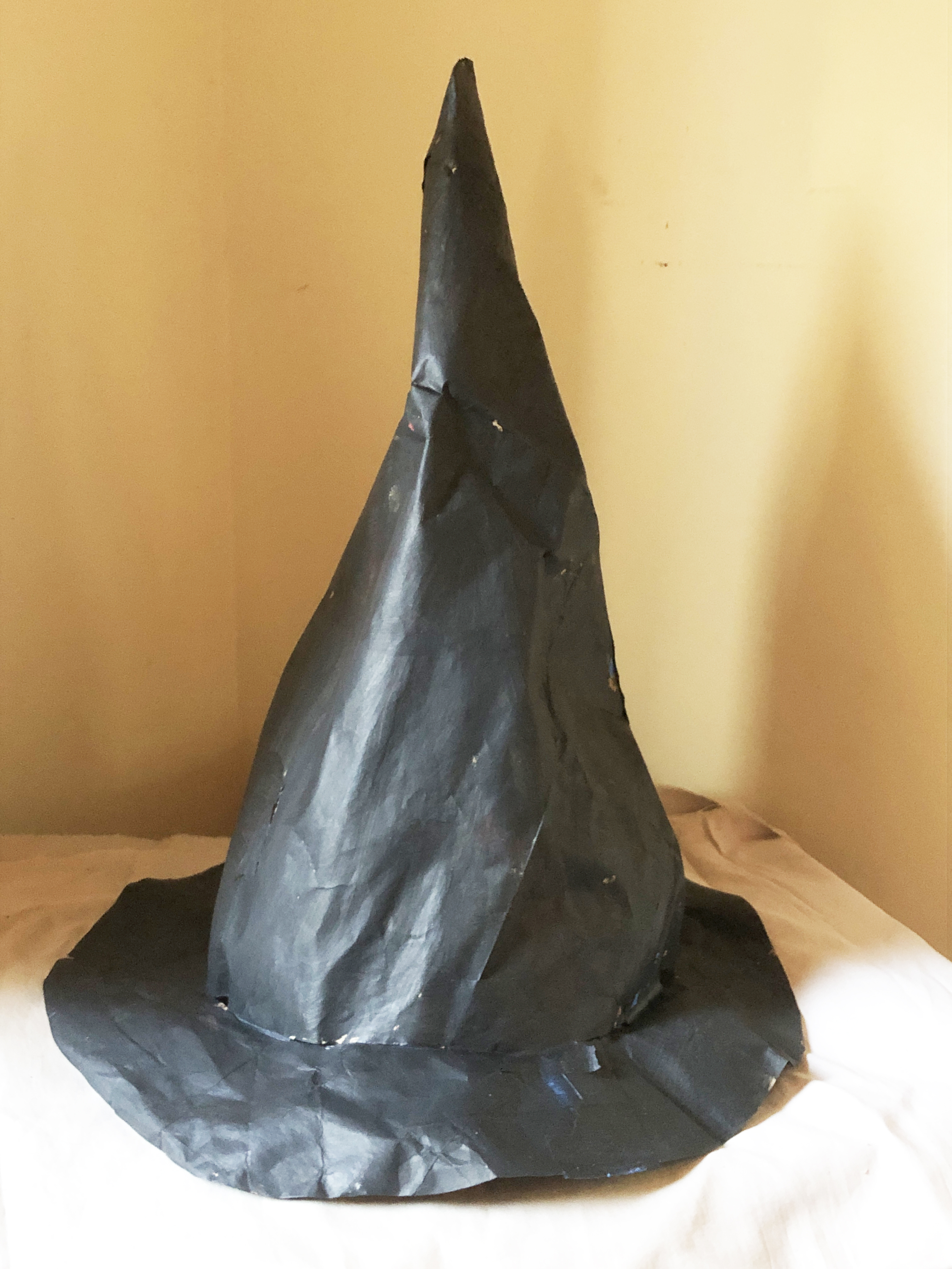 I created this witch hat from a paper grocery bag, and I created a pattern with instructions so you can do the same. All you need are the printed template, a paper grocery bag, tape, and paint. It’s about 14 or 15 inches tall. This item is a digital download so you can DIY your own costume.