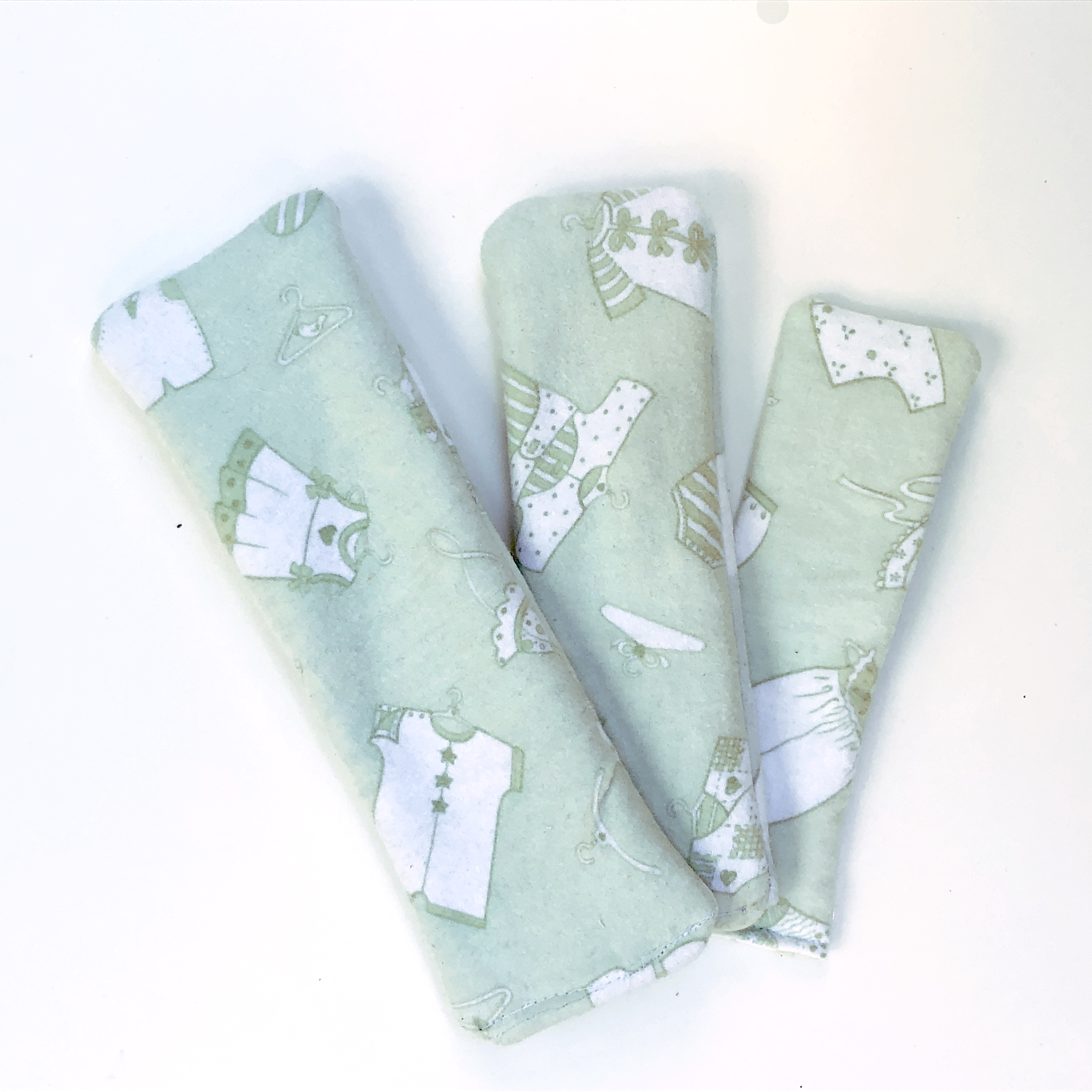 Bypass the snaps and get these straightforward pads instead. The fact is, cloth pads with wings and snaps shift. These cloth pads are meant to be used with a safety pin. The combination of flannel fabric on the underside plus the safety pin ensure the pad won’t slip around. Simply pin from the underside of the underwear through a couple of layers of pad. Safety pinning takes about the same amount of time as snapping, and it’s far more secure.