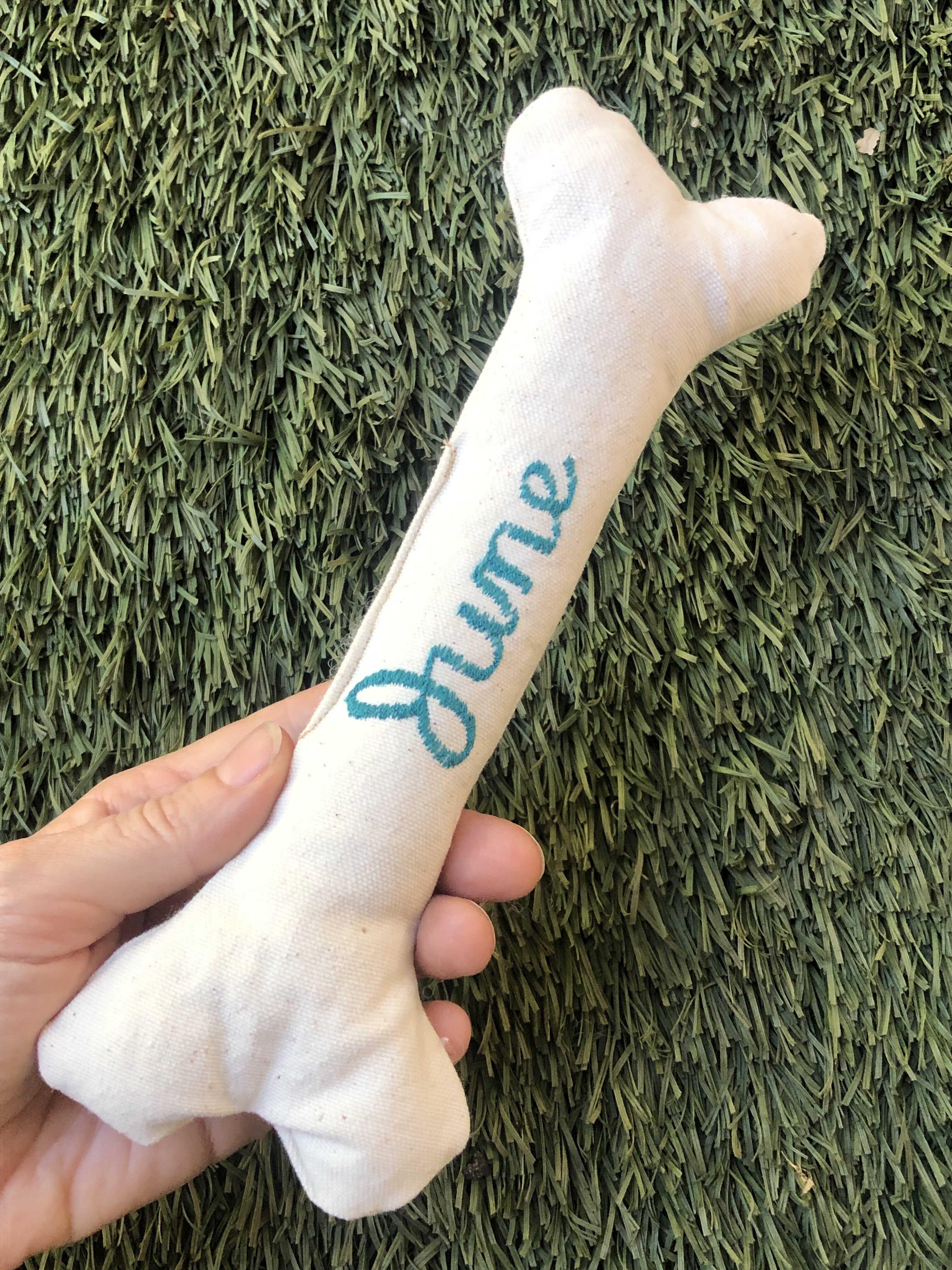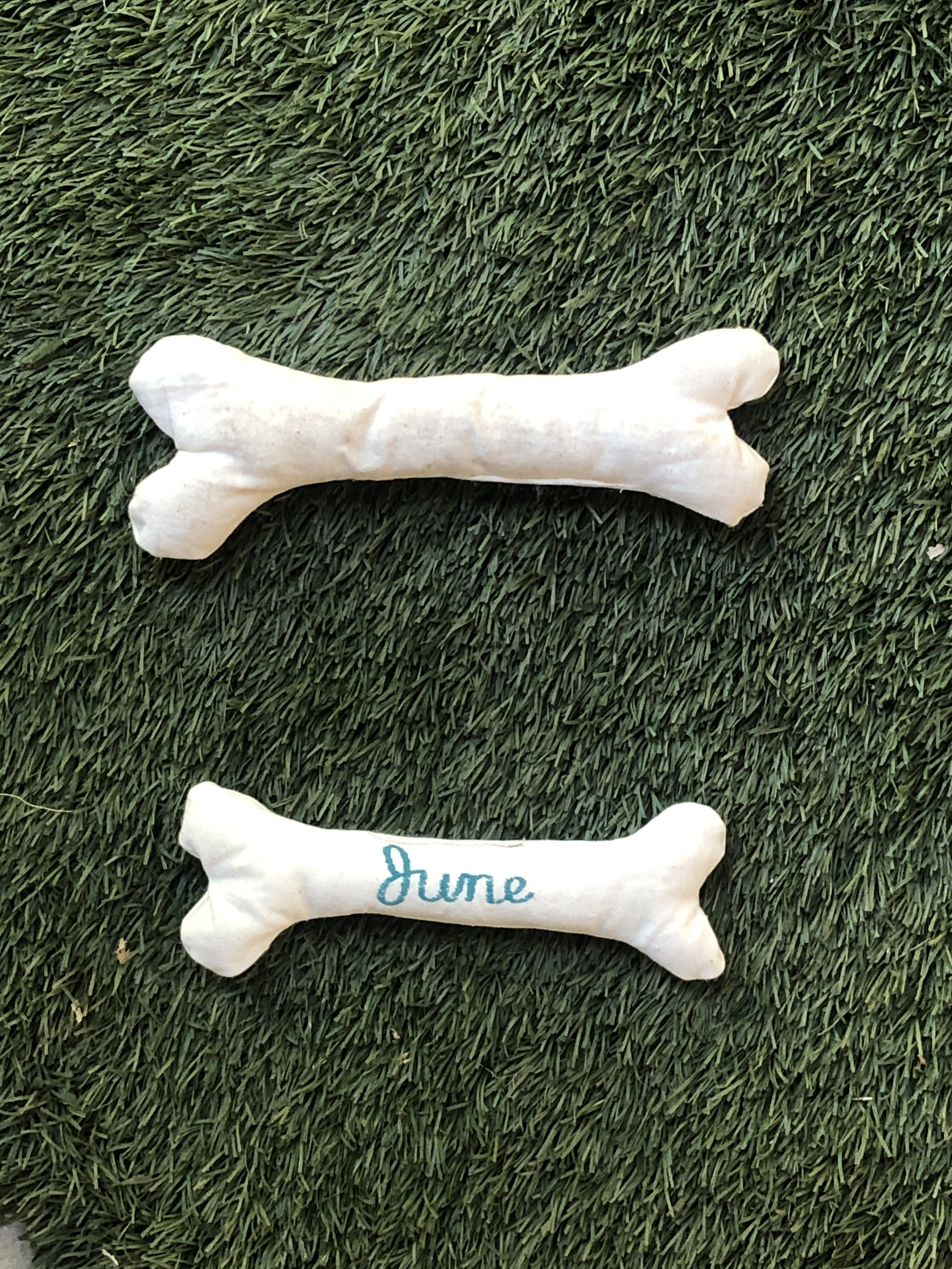 I sew each by hand, and, for customers who order through my shop, I will embroider a name on your bone. I hand embroider with the sewing machine which means I guide the fabric through and “write” in my own handwriting. Simply leave a note in your order if you would like a name embroidered.