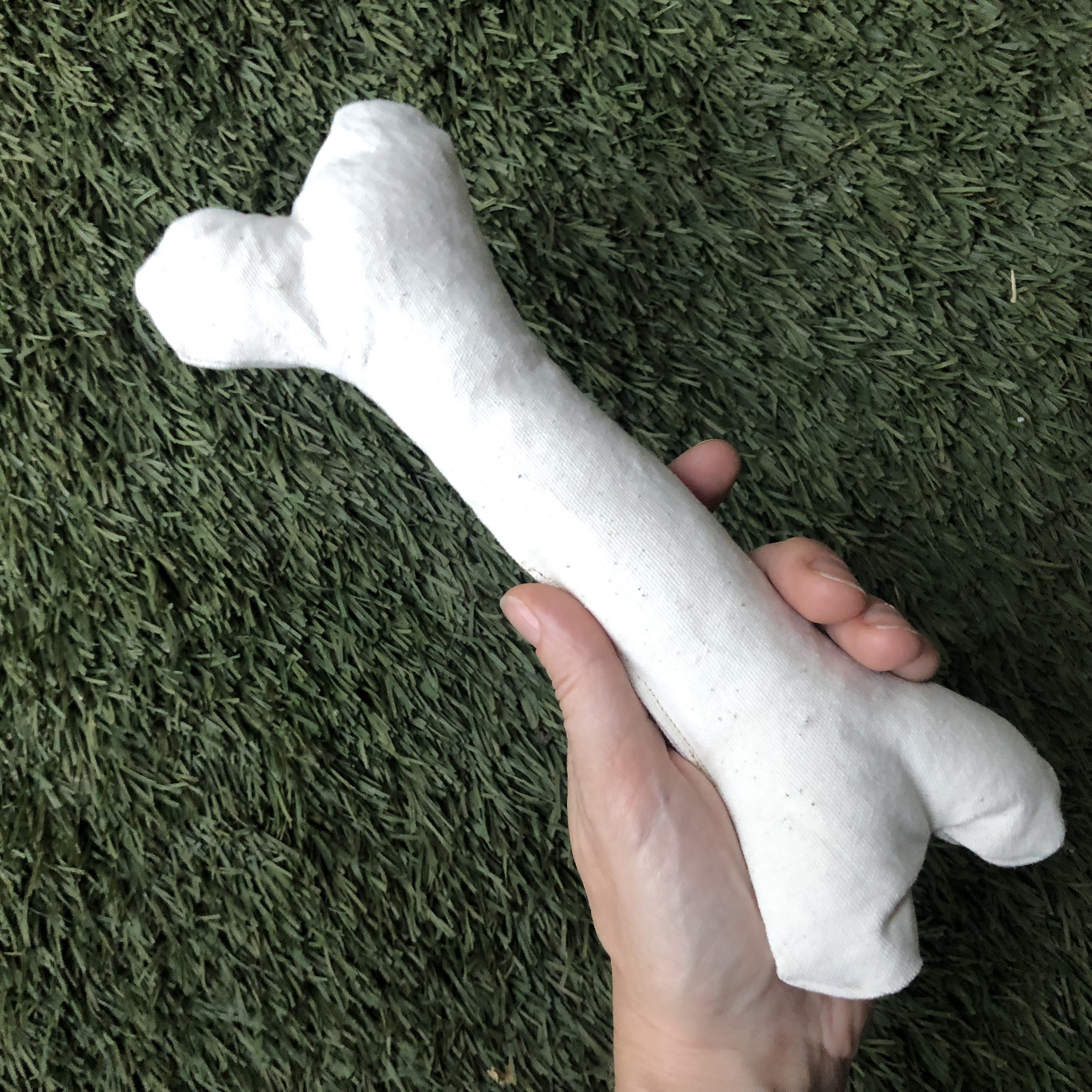 I created this natural dog toy so I don’t have to worry when my pet plays on her own. This bone shaped toy is non toxic, made from natural cotton canvas and stuffed with wool from a sheep farm in my state. This toy comes in 3 sizes. Small is 7 inches from end to end, medium is 9″, and large is 11 inches.