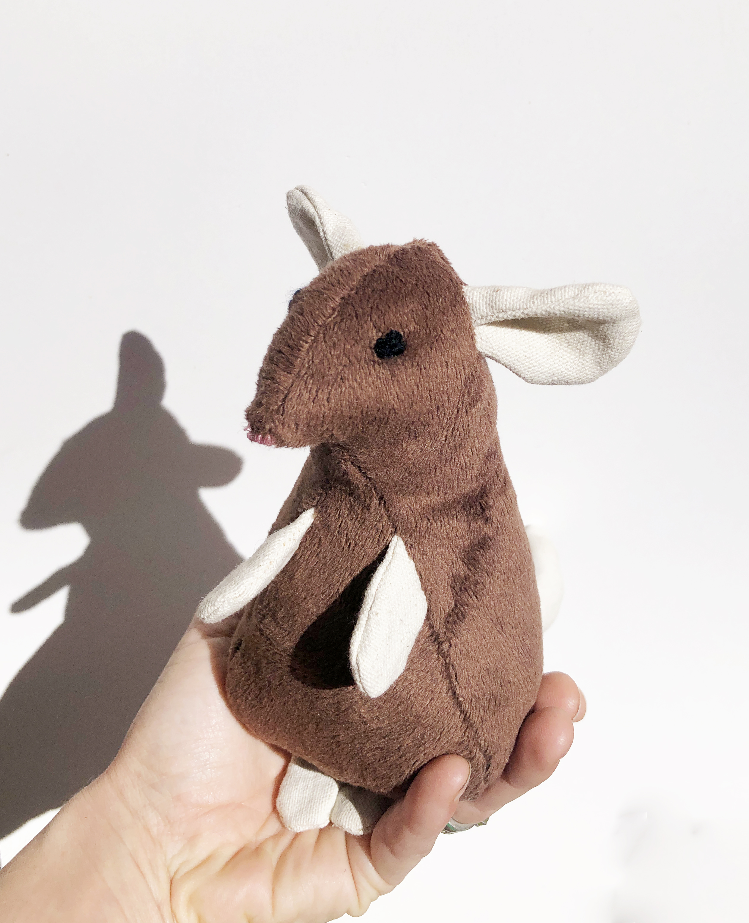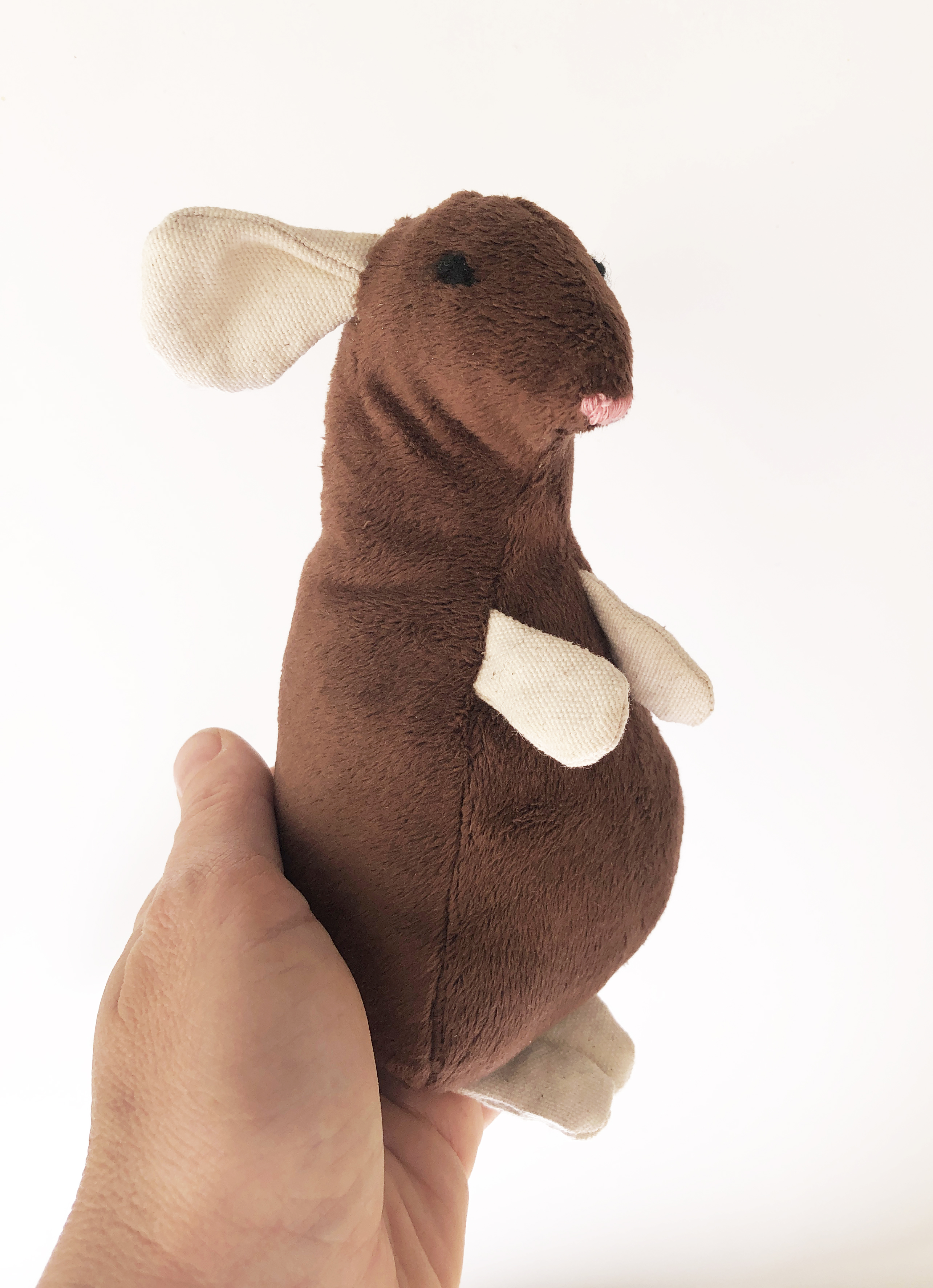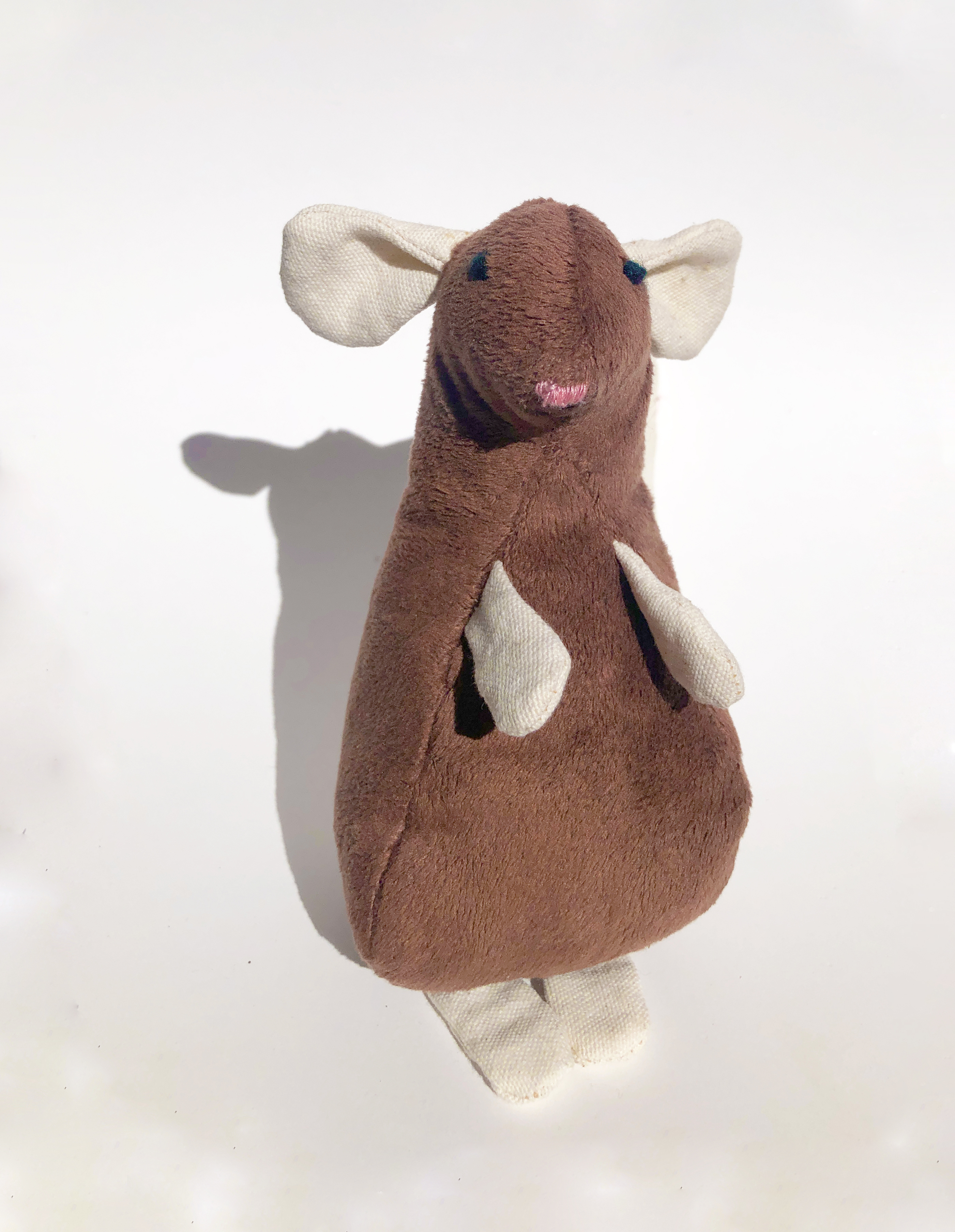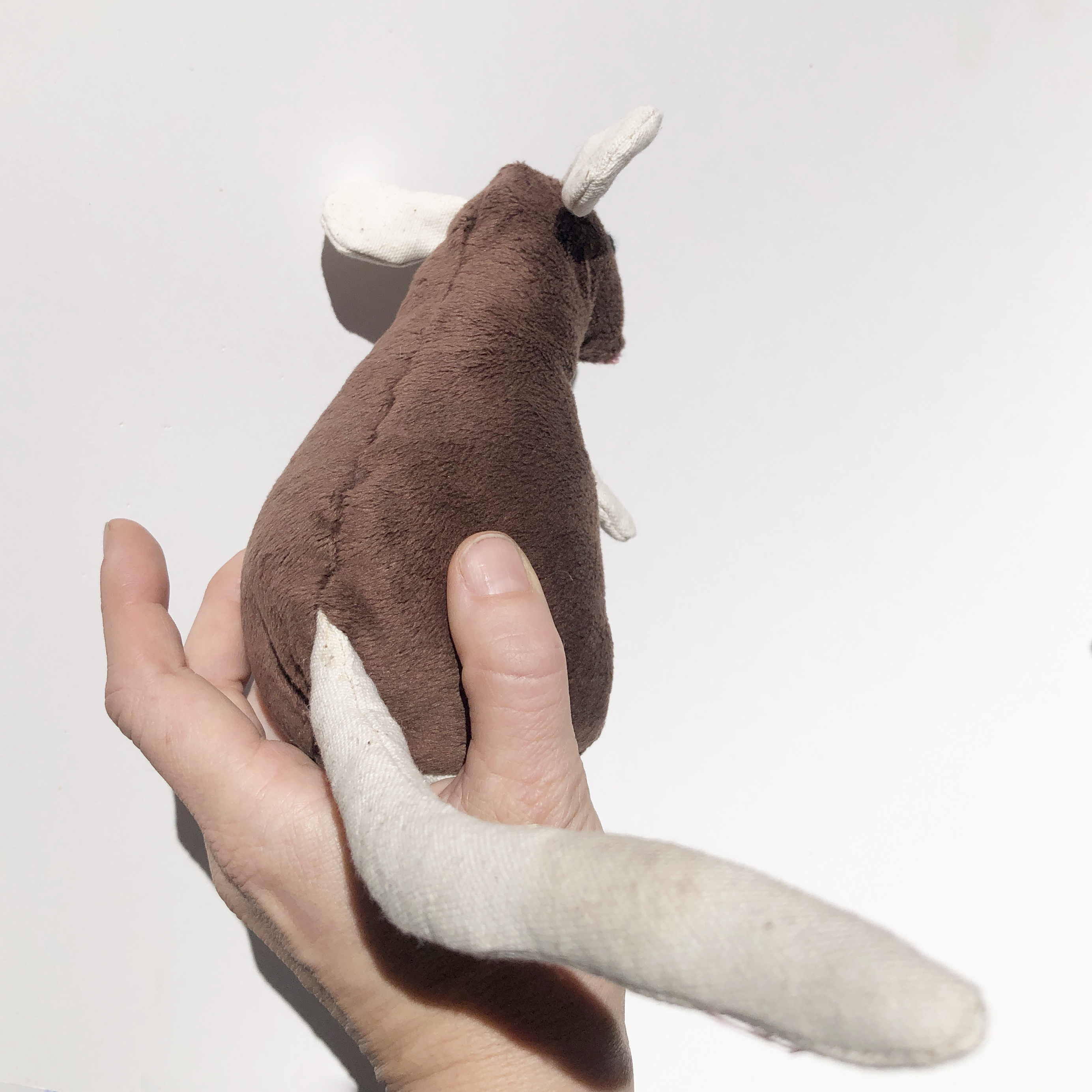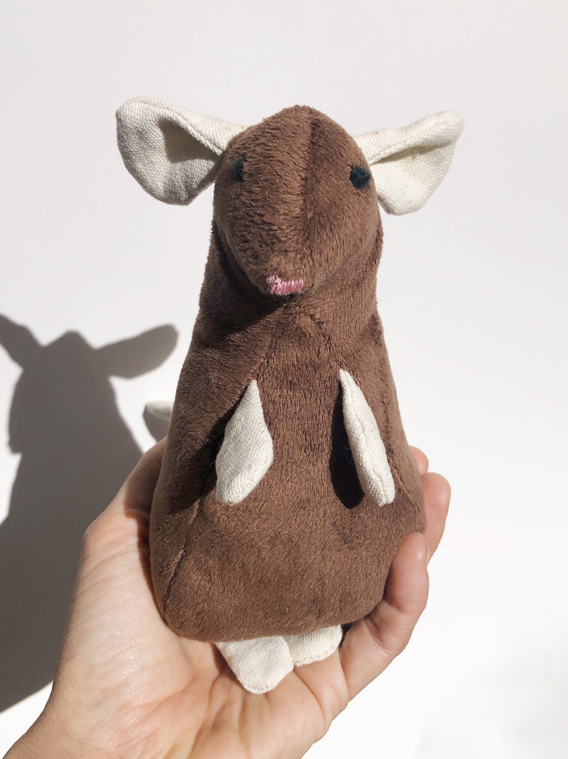 I designed and sewed this brown minky rat plush. About 7.5″ tall and 3.5″ wide, and 10 inches from tail to tummy. Made from a soft brown minky cloth with canvas features, it is very nice to pet.